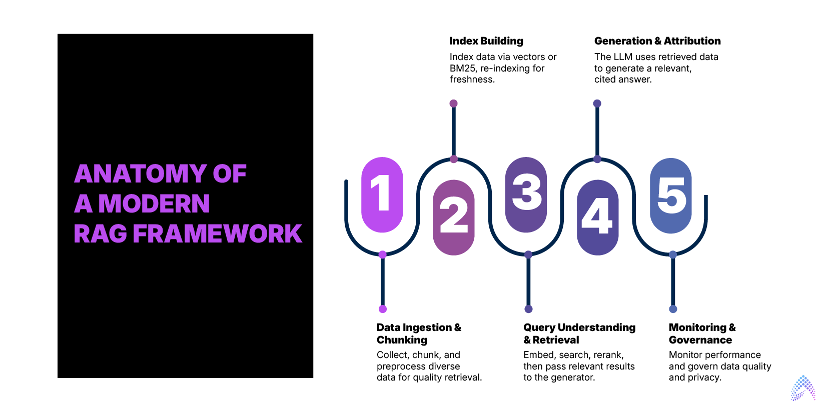The RAG framework is a modular, dynamic approach that enables continuous access to fresh knowledge without retraining the model, delivering accurate, citation-backed results.